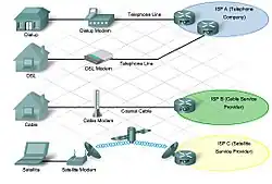 Auf der sogenannten letzten Meile, also bei den Hausanschlüssen, werden die Daten oft auf Kupferleitungen von Telefon- oder Fernsehanschlüssen und vermehrt auch über Funk, mittels WLAN oder Mobilfunk (anfangs UMTS, gefolgt von LTE, 5G usw.), übertragen. Glasfasern bis zum Haus (FTTH) sind in Deutschland noch nicht sehr weit verbreitet. Privatpersonen greifen auf das Internet entweder über einen Schmalbandanschluss, zum Beispiel per Modem oder ISDN (siehe auch Internet by Call), oder über einen Breitbandzugang, zum Beispiel mit DSL, Kabelmodem oder Mobilfunk, eines Internetproviders zu. Firmen oder staatliche Einrichtungen sind häufig per Standleitung auf Kupfer- oder Glasfaserbasis mit dem Internet verbunden, wobei Techniken wie Kanalbündelung, ATM, SDH oder – immer häufiger – Ethernet in allen Geschwindigkeitsvarianten zum Einsatz kommen.