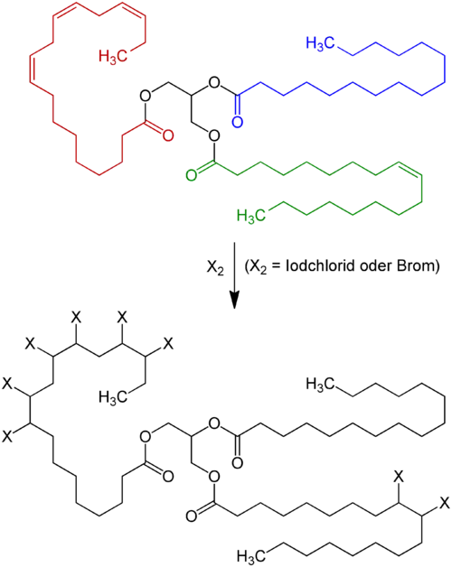 Unten das Reaktionsprodukt nach der Addition von vier Äquivalenten Iodchlorid oder Brom an den vier C=C-Doppelbindungen der ungesättigten Fettsäurereste.