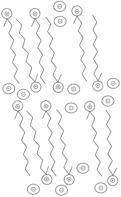 Für 1-Alkyl-1-methylpyrrolidiniumbis(trifluormethylsulfonyl)amide [CnC1Pyrr][NTf2] kann ein ähnlicher Trend beobachtet werden. Bis zu einer Kettenlänge von n=8 organisiert sich diese ionische Flüssigkeit in alternierende Monolagen aus Anionen und Kationen. Ab einer Kettenlänge von n=10 bildet sich eine Doppelschicht, ähnlich einer Doppellipidschicht, aus.[49] Die Wechselwirkungen in den alternierenden Monolagen können durch Poisson-Boltzmann-Gleichungen höherer Ordnung beschrieben werden.[50]