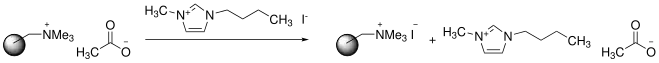 Die dritte Möglichkeit ist der Einsatz eines Austauscherharzes.[28] Im Labormaßstab wird eine Säule mit einem Austauscherharz wie Amberlist 26, das quartäre Ammoniumgruppen auf der Oberfläche trägt, eingesetzt. Das kommerziell erhältliche Harz liegt in der OH-Form vor, die Anionen sind Hydroxidionen. Diese können ausgetauscht werden, indem eine Lösung mit dem gewünschten Anion in Form der konjugierten Säure, einem Metall- oder Ammoniumsalz über die Säule gegeben wird. Die Hydroxidionen werden von der Säule gewaschen, die gewünschten Anionen verbleiben auf der Säule. Über die vorbehandelte Säule kann eine Lösung des gewünschten Kations, meist als Halidsalz, gegeben werden. Während der Elution werden die Anionen ausgetauscht und die gewünschte Ionenkombination wird erhalten. Als Beispiel dient die Herstellung von 1-Butyl-3-methylimidazoliumacetat:[33]