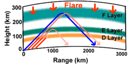 Koronaler Massenauswurf aus einem Flare (Sonne)Die Ausbreitungsbedingungen bei einem Flare (rote Strahlen) verglichen mit denen einer normalen, ruhigen Ionosphäre (blauer Strahl): Die Elektronendichte ist in allen Schichten erhöht. Dies führt zu erhöhter Dämpfung in der D-Schicht (mattes Rot) bis hin zum totalen Signalverlust oder ungewöhnlicher Brechung an der E-Schicht.