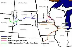 - Pingree Grove (bei Elgin)–Davis–Savanna–Sabula Junction–Clinton–Davenport–Muscatine–Polo–Kansas City (736 km; davon 68,4 km südlich von Polo zweigleisig. Je ein Gleis war Eigentum der IC&E und der Union Pacific Railroad, die zusammen beide Gleise im Richtungsbetrieb nutzten)