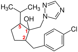 Bei der Betrachtung der Stereoisomere von Ipconazol wird folgende Nummerierung der Stereozentren am Cyclopentanring verwendet: