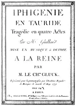 Der Stoff von Iphigénie en Tauride war seinerzeit populär. In den hundert Jahren vor 1779 waren mindestens fünf Tragödien und dreizehn Opern über die Geschwister Iphigenie und Orestes auf Tauris erschienen. Am bekanntesten sind die Skizze Iphigénie en Tauride von Racine (veröffentlicht 1674), die Tragödie Oreste et Pylade von François Joseph de Lagrange-Chancel (1697), deren Übertragung Die Geschwister in Taurien (später Orest und Pylades) von Johann Elias Schlegel (1737) sowie das Bühnenstück Iphigénie en Tauride von Claude Guimond de La Touche (1757). Zu den Verarbeitungen für die Oper zählen Oreste von Georg Friedrich Händel (UA 1734), Ifigenia in Tauride von Tommaso Traetta (1763), Ifigenia in Tauride von Gian Francesco de Majo (1764) und Ifigenia in Tauride von Niccolò Jommelli (1771). Davon waren die Traetta-Oper und die Tragödie von La Touche große Erfolge.[3]