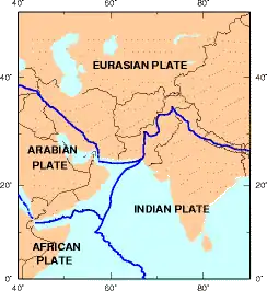 Das Hochland bildet sich aus einer tektonischen Platte (Iranische Platte), als Teil der Eurasischen Platte, eingekeilt zwischen der Arabischen und der Indischen Platte. Es gehört zum alpidischen Gebirgsgürtel, der im Norden im Raum Kurdistan in das Anatolische Hochland und die Kaukasusregion übergeht und im Osten, in der Hindukuschregion, dem Pamir und dem Himalaya Fortsetzung findet. Die eigentlichen Faltengebirge, die das Hochland als Randgebirge umgrenzen, sind das Elbursgebirge (Kuh-e Alborz) im Norden, gegen das Kaspische Meer und Kopet Dag und Aladağlar gegen die Karakum, im Westen und Südwesten das Zagrosgebirge gegen die Euphratniederungen und den Persischen Golf. Im Südosten geht das Hochland über die Gebirgszüge Kuh-e Jebal Barez, Kuh-e Birag, Kuh-e Taftan und Kuh-i Sultangruppe und die Senke Jaz Murian in die Bergregion Belutschistan über. Das Hochland selbst ist nicht der alpidischen Orogenese zuzuordnen, sondern eher in Zusammenhang mit der Bildungen von Ural und Hajar (Omanzug) zu sehen.[6] Aufgrund der aktiven Tektonik ist die Region erdbebengefährdet und zeigt rezenten Vulkanismus.[7]