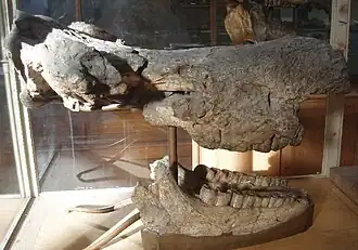 Der Unterkiefer war schmal, aber robust und wies eine Länge von etwa 54 cm auf. Er besaß eine kräftige Symphyse, die bis zur Mitte des dritten Prämolaren reichte. Im Gebiss fehlte wie bei allen späteren Elasmotherien die vordere Bezahnung bestehend aus den Schneide- und Eckzähnen und besaß dadurch eine reduzierte Zahnanzahl. Die Backenzähne waren weit nach vorn gerückt und umfassten jeweils drei Prämolaren und drei Molaren, so dass die Gebissformel ausgewachsener Tiere folgendermaßen lautete: . Das Milchgebiss wies aber noch den vordersten Prämolaren auf. Die Prämolaren waren weitgehend molarisiert, der erste hatte jedoch nur eine geringe Größe. Dagegen glichen die hinteren Prämolaren in ihrer Größe eher den Molaren. Von diesen hatte der zweite Molar die jeweils größten Ausmaße im Gebiss. Die Zahnkronen der hinteren Backenzähne waren sehr hoch (hypsodont), erreichten aber noch nicht die Werte der späteren Elasmotherien. Die maximale Höhe betrug 10 cm. Sie enthielten viel Zahnzement, besaßen aber nur leicht geschwungene Zahnschmelzfalten, die die starken Verwinkelungen der Molaren der nachfolgenden Gattungen noch nicht ausgebildet hatten.[1]
