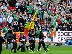 Die Flagge Irlands wird ausschließlich bei Spielen in Dublin gehisst, und dies auch nur zusammen mit einer Flagge, welche die vier historischen Provinzen Irlands (Connacht, Leinster, Munster und Ulster) symbolisiert. Bei Auswärtsspielen wird nur die Verbandsflagge gehisst. Häufig verwendet wird das typisch irische Shamrock-Symbol. Während der Weltmeisterschaften 2011, 2015 und 2019 betrat die irische Mannschaft das Spielfeld sowohl mit der Flagge der Republik Irland als auch mit der Flagge der Provinz Ulster.[109]