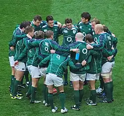 Die irische Rugby-Union-Nationalmannschaft ist eine der wenigen nationalen Mannschaften auf der Insel, die sowohl bei irischen Nationalisten als auch bei den Anhängern einer Union mit dem Vereinigten Königreich Unterstützung genießt. Da die Mannschaft sich aus Spielern aus zwei voneinander unabhängigen Ländern zusammensetzt, gab es in der Vergangenheit mehrmals Kontroversen über die zu verwendenden Flaggen und Hymnen. Als die irischen Länderspiele noch abwechslungsweise in Belfast und Dublin ausgetragen wurden, ertönte bei den Spielen in Belfast die britische Nationalhymne God Save the Queen, bei den Spielen in Dublin die irische Nationalhymne Amhrán na bhFiann. Bei Auswärtsspielen wurde keine Hymne gespielt. Von 1954 bis 2007 verzichtete die IRFU ganz darauf, Test Matches in Belfast auszutragen, um möglichen Konflikten zwischen Nationalisten und Unionisten in Nordirland von vornherein aus dem Weg zu gehen.[102] Während der Weltmeisterschaft 1987 diente die traditionelle Ballade The Rose of Tralee (in einer Interpretation von James Last) als Hymne Irlands.[103]
