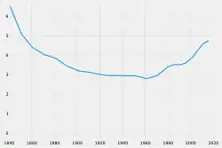 2016 nahm die Bevölkerung Irlands allein durch Geburtenüberschüsse um etwa ein Prozent zu. Das Medianalter der Bevölkerung betrug 36,6 Jahre, der geringste Wert in einem EU-Land. Derzeit gab es in Irland viele Menschen im Familiengründungsalter und vergleichsweise wenige Menschen im Rentenalter. Dies ist eine Folge davon, dass die Geburtenrate noch bis in die 1970er Jahre bei knapp vier Kindern je Frau lag, deutlich höher als überall sonst in der westlichen Welt. Diese geburtenstarken Jahrgänge tragen zur wirtschaftlichen Prosperität bei. Nach den 1970ern sank die Geburtenrate zwar, aber nie deutlich unter die Nettoreproduktionsrate.[22]