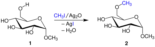 Die Zugabe von Iodmethan und Silber(I)-oxid zu der Verbindung 1 führt zum Ablauf einer nukleophilen Substitution unter Bildung der Verbindung 2, welche eine Ether- anstelle einer Hydroxidgruppe aufweist. Als Nebenprodukte entstehen dabei Silberiodid und Wasser.[2]