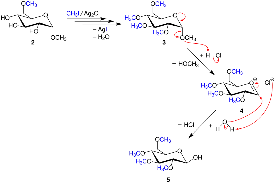 Durch weitere Zugabe von Iodmethan und Silber(I)-oxid wird die Verbindung 2 vollständig methyliert. Zu der gebildeten Verbindung 3 wird Salzsäure gegeben, wodurch die anomere Ethergruppe unter Bildung des Intermediates 4 und Abspaltung von Methanol entfernt und mit nachfolgender Hydrolyse durch eine Hydroxidgruppe ersetzt wird. Unter Abspaltung von Salzsäure wird das Reaktionsprodukt 5 erhalten.