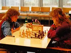 Isabel Hund (links) beim Simultanspiel von Garri Kasparow 1985 in Hamburg