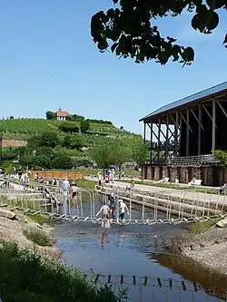 An der Nahtstelle zwischen der Isenach und dem aufgelassenen Frankenthaler Kanal befindet sich die alte Schleuse, die in der zweiten Hälfte des 20. Jahrhunderts zum Rückhaltebecken für den Fall von Hochwasser ausgebaut wurde.
