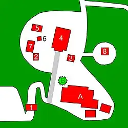 Man betritt den Tempel durch das Tempeltor (山門 Sanmon; 1) und steigt dann einen gewundenen Weg hoch zur Tempelanlage. Oben angekommen hat man zur rechten Seite das Abtquartier (A), den „Heiligen Baum“ (御神木 O-Shimboku; B). Geht man weiter, sieht man auf der linken Seite den Glockenturm (鐘楼 Shōrō; 2). Er stammt aus dem Jahr 1738, die Tempelglocke aus dem Jahr 1331. Auf der rechten Seite steht die Schatzpagode (多宝塔 Tahōtō, 3). Sie wurde im Jahr 1545 von Maru Tsunetsuna (丸 常綱) gestiftet und ist als WK registriert. Nun steht man vor der Haupthalle (本堂 Hondō; 4; WK). Sie ist Zen-Stil ausgeführt. Sie dürfte aus der Erbauungszeit der Anlage stammen. Links von der Haupthalle stehen die Gebetsstätten Taishi-dō (太子堂; 5) und Sannō-dō (山王堂; 7[A 1]), letztere aus der Sengoku-Zeit. Davor steht eine kleine Pagode in der Form der Hōkyōintō (宝篋印塔; 6), hier etwas ungewöhnlich nicht aus Stein, sondern aus Bronze. Sie wurde 1841 angefertigt.