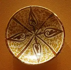 Während Fayencen zunächst nur in Form von Gefäßen auftraten, ist gelüsterte Keramik durch den Dekor des mihrāb der großen Moschee von Kairouan, der aus 139 Lüsterfliesen besteht, bereits für das neunte Jahrhundert auch in Form von Wandfliesen belegt. Schriftlichen Zeugnissen zufolge sollen die Fliesen ursprünglich um 862 von einem Meister aus Basra geliefert worden sein, jedoch zeigen sich in der Motivgestaltung auch deutliche ostislamische Einflüsse.[14] Weitere frühe Beispiele für Lüsterkeramik wurden in Samarra gefunden. Ursprünglich entwickelt wurde die Technik wahrscheinlich von den Glasherstellern – das wohl älteste Objekt ist ein gelüsterter Glasbecher, das mit großer Wahrscheinlichkeit in das Jahr 773 datiert werden kann.[15] Die Herstellung von Lüsterkeramik war ausgesprochen aufwändig und teuer: Die bereits fertig glasierte und gebrannte Töpferware wurde dazu mit einer Schicht aus Schwefel, Silber- und Kupferoxid sowie gesäuertem Ocker überzogen, die durch einen Reduktionsbrand auf der Keramik fixiert wurde und so einen metallisch schimmernden dünnen Film auf den Objekten hinterließ.
