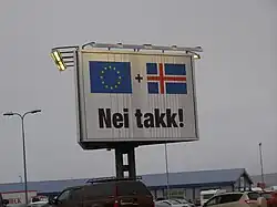 Im September 2009 stieg die Ablehnung der Isländer bezüglich eines EU-Beitritts auf ein Rekordhoch von 61,5 Prozent. Als einer der möglichen Gründe dieser starken Ablehnung wurden die Haltungen der britischen und der niederländischen Regierungen im Icesave-Streit gesehen.[44] Für einen Beitritt waren lediglich 38,5 Prozent der Befragten. In von 2009 bis 2022 veröffentlichten Meinungsumfragen hat sich eine Mehrheit der Isländer gegen den EU-Beitritt ausgesprochen.[45] Im März 2022 ergab eine Gallup-Umfrage erstmals seit Jahren wieder eine relative Mehrheit (47 Prozent) für einen Beitritt zur Europäischen Union, 33 Prozent waren dagegen.[46]