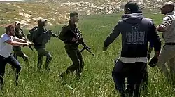 3. Zum Schutz von Siedlungen abgestellte Militärs, die gemäß Artikel 27 des Genfer Abkommens IV Palästinenser ebenso schützen müssen wie Siedler, unterstehen d. Ö. dem direkten Kommando der CSCs[87] oder inoffiziell dem Kommando der Siedler, die sie angestellt haben,[88] weshalb Siedlergewalt auch die Form von durch zivile Kräfte angeordneter staatlicher Gewalt annehmen kann. Auch deshalb zieht Siedlergewalt auch dann, wenn sie nicht schon selbst mit Morden oder Verletzungen einhergeht, oft nach sich, dass nach einer Anbahnung von Konflikten (von Siedlern gewählte und angestellte) Sicherheitskräfte und (diesen unterstehende) Militärs eingreifen, wonach dann diese Institutionen töten oder verletzen.[89][90][91][92] Vom 20. Dezember 2022 bis zum 18. September 2023 etwa wurden ca. 2000 Palästinenser von Vertretern der Staatsgewalt verletzt, nachdem Siedler einen Konflikt angebahnt hatten.[93]