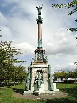 Daran schließt sich die 9 Meter hohe Granitsäule an, die unten ein breites Bronzeband mit Wellen, Muscheln und Meerespflanzen trägt. Die Säule endet mit einem romantisierten ionischen Kapitell aus Bronze. Den krönenden Abschluss bildet die 4 m hohe Bronzestatue der Siegesgöttin Victoria, die auf einer Kugel steht und von Flammen umgeben ist. Die Siegesgöttin hat große Flügel und trägt ein langes, ärmelloses Gewand, das ihr linkes Bein und ihren nackten Fuß freilässt. In der rechten Hand hält sie einen Friedenszweig. Ihr leicht trauriger Blick folgt der erhobenen linken Hand, die sich nach oben richtet.[4]