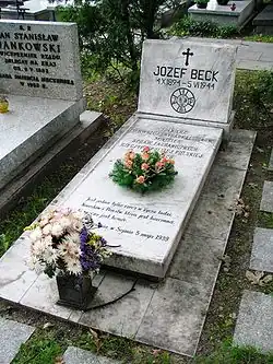 Nach dem deutschen Überfall auf Polen am 1. September 1939 blieb Beck bis zum Beginn der sowjetischen Besetzung Ostpolens am 17. September 1939 im Amt und verließ in der folgenden Nacht mit anderen Regierungsmitgliedern Warschau in Richtung Rumänien, wo er von den Behörden interniert wurde. Obwohl er bald darauf ein britisches Einreisevisum erhielt, verhinderte General Władysław Sikorski, ein erklärter politischer Feind Piłsudskis und seiner Anhänger, Becks Ausreise aus Rumänien. Beck blieb unter Aufsicht der rumänischen Polizei und bekam als Wohnsitz zunächst eine Villa in Bukarest, später eine aus Lehm gebaute Bauernkate im südrumänischen Dorf Stănești zugewiesen. Dort verfasste er seine Memoiren mit dem Titel Ostatni raport (Finaler Report) und vertrieb sich die Zeit mit dem Bau von Modellschiffen.[2] Er starb dort am 5. Juni 1944, vermutlich an Tuberkulose. Beck wurde durch einen ungarischen Pastor auf einem calvinistischen Friedhof beerdigt. Im Jahr 1991 wurden seine sterblichen Überreste nach Polen überführt und auf dem militärischen Teil des Powązki-Friedhofes in Warschau beigesetzt.
