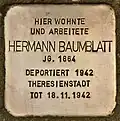 | Hermann Baumblatt | 1864–1942 | Bäckermeister | Tod im Ghetto Theresienstadt | Badgasse 4 |