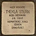 | Therese Adler, geb. Rosenthal | 1887 – ?? | Deportation in das Ghetto Izbica, Tod wahrscheinlich im Ghetto Krasnystaw, genauer Todeszeitpunkt unbekannt | Hartmannstraße 5 |