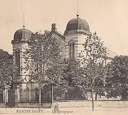 Die erste Synagoge von Remiremont wurde 1825 in einem Privathaus errichtet. Eine zweite Synagoge wurde 1837 in der Rue Maucherville Nr. 10, der ehemaligen Judengasse, eingerichtet. Im Jahr 1884 wurde eine Synagoge in der Avenue Arnot erbaut, die einen Unterrichtsraum im Erdgeschoss und eine Rabbinerwohnung im ersten Stock besaß. Nachdem diese Synagoge 1970 verkauft worden war, wurde der Bau von dem neuen Besitzer abgerissen.