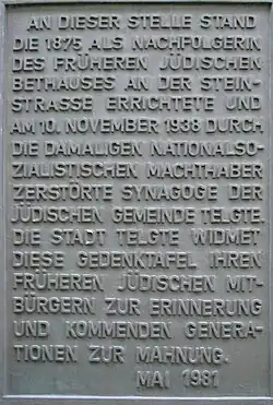 Die erste Nennung eines Juden in Telgte stammt aus dem Jahr 1539. 1555 erhielt Salomon von Wasungen, der aus Münster ausgewiesen worden war, einen Geleitbrief von Fürstbischof Wilhelm Ketteler und hielt sich fortan in Telgte auf. 1615 wurde der erste jüdische Begräbnisplatz in Telgte durch einen anderen Salomon erworben. Aus dem Jahr 1740 stammt die erste Erwähnung einer Synagoge, zu der auch eine jüdische Schule gehörte. Die alte Telgter Synagoge, die bis ins ausgehende 19. Jahrhundert als solche genutzt wurde, ist erhalten. Das Gebäude befindet sich in Privateigentum und steht zwischen der Stein- und der Emsstraße. 1779 waren insgesamt sieben jüdische Familien in Telgte ansässig, 1817 gehörten 73 Personen der Gemeinde an.[1] Seit 1848 war Telgte der Sitz der Synagogengemeinde für den Landkreis Münster.
