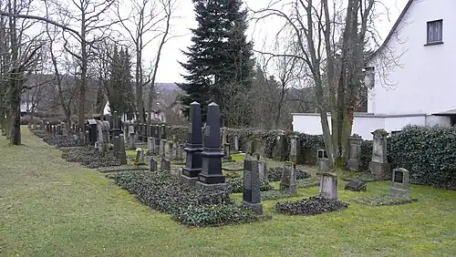 Daraufhin legte die Gemeinde im Einvernehmen des Magistrats an der Wohlgrabenstrasse, heute Bergstraße, einen neuen Friedhof (⊙) auf. Am 16. Juni 1881 wurde er eingeweiht. Auf dem 31,41 Ar großen Friedhofsgelände wurde auch ein kleines Taharahaus errichtet. Dabei weist die Anordnung von Grab und Grabstein eine Besonderheit auf, da in Wetzlar bereits im 19. Jahrhundert der Grabstein hinter das Grab gesetzt wurde, wie es auf christlichen Friedhöfen üblich ist. Am 2. November 1881 ist die erste Beisetzung nachzuweisen.[19] Insgesamt wurden 115 Juden bis 1940 hier beerdigt. Dazu zählten auch Kriegsgefangene des Ersten Weltkriegs aus Polen und Russland, die im Wetzlarer Lazarett starben. In der Nachkriegszeit wurden außerdem 45 Displaced Persons bestattet. 1969 exhumierte man sechs Gräber auf dem jüdischen Friedhof in Atzbach und überführte sie nach Wetzlar.[2]