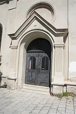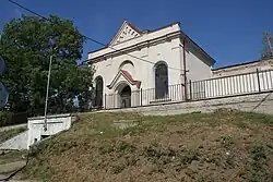 Die Trauerhalle im Stil des Neoklassizismus besitzt ein Portal mit Dreiecksgiebel, der auf Pilastern ruht.