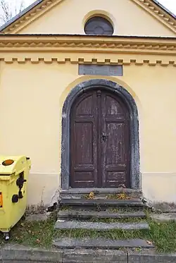 Die Trauerhalle im Stil des Historismus besitzt ein Rundbogenportal mit einem Ochsenauge darüber.