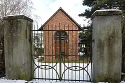 Das 1908 erbaute Taharahaus steht in der Mitte des Friedhofs und auf einer Achse mit dem Friedhofseingang. Das 4,1 m mal 5,8 m große Gebäude hat an der Vorder- und Rückseite jeweils eine Tür mit aufgesetztem Hufeisenbogenfenster. Es ist nach Norden ausgerichtet und an der West- und Ostseite befindet sich je ein Fenster mit Hufeisenbogen. Die Leichenhalle ist aus Ziegelsteinen gemauert und die Fenster, Türen, der Giebel und die Gebäudeecken werden durch hervorstehende Ziegel betont. Die zwei Innenräume waren durch eine Tür getrennt und werden von einer Längstonne überwölbt.