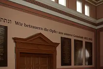 Nach langwierigen Recherchen über das Schicksal der ermordeten Bamberger Juden konnten am 10. November 1995 in der Trauerhalle sechs Gedenktafeln mit den Namen der Opfer eingeweiht werden. Die Tafeln wurden auf Initiative von Herbert Loebl aus Newcastle upon Tyne, einem der letzten Nachkommen Bamberger Juden vor dem Krieg, hergestellt. Sie wurden gegenüber dem Denkmal für die im Ersten Weltkrieg Gefallenen angebracht.[15] Im Gebäude zeigt eine Dauerausstellung des Stadtarchivs Bamberg verschiedene Aspekte des jüdischen Lebens in Bamberg vor 1938.[16]