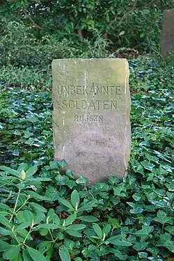 Weitere 9 Grabsteine mit der Inschrift „unbekannte russische Soldaten“ markieren im vorderen Friedhofsbereich die Gräber von sowjetischen Kriegsgefangenen, die während des Zweiten Weltkriegs auf dem Jüdischen Friedhof in Sammelgräbern bestattet worden sind. Bei 7 der 9 Grabsteine ist die Anzahl der Toten angegeben: 6 beziehungsweise 7 − insgesamt 44 Tote. Bei 2 Grabsteinen lautet die Inschrift nur „Unbekannte Soldaten Russen“.
