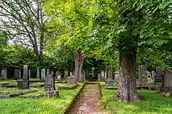 Der Friedhof liegt auf der Parzelle 1391/1 am Klosterweg gegenüber der Einmündung des Mariannenwegs[2]. 208 Grabinschriften aus dem Zeitraum von 1718 bis 1937 sind dokumentiert[3]. Im ältesten Teil des Friedhofes, der vom Eingang aus gesehen im hinteren Bereich liegt, haben sich zahlreiche bemerkenswerte Grabsteine erhalten, die noch bis zum Anfang des 18. Jahrhunderts datieren[2].