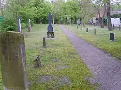 Neben dem Haupteingang ist in den Torpfeiler eine Tafel eingelassen mit folgender Inschrift: „Der Staub kehrt zurück/zur Erde, was er war,/der Geist aber/kehrt zu/Gott zurück, der ihn gegeben“. Auf dem Friedhof verläuft entlang der Friedhofsmauer ein 2 m breiter unbefestigter Weg und ein weiterer 1,5 m breiter unbefestigter Weg teilt die Anlage in der Mitte.