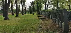 Der Friedhof ist von einer Ziegelsteinmauer umgeben. Das eiserne Tor ist verschlossen. Ein Schild am Eingang weist darauf hin, dass auf dem Friedhof auch 24 osteuropäische Zwangsarbeiter begraben sind.