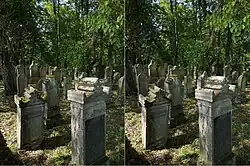 Während der Zeit des Nationalsozialismus sollte die politische Gemeinde den jüdischen Friedhof nicht nur erwerben, sondern auch einebnen und landwirtschaftlich nutzen. So wurde 1944 zwar mit der Reichsvereinigung der Juden in Deutschland ein Kaufvertrag abgeschlossen, dieser aber nicht im Grundbuch eingetragen. Sogar das schmiedeeiserne Tor wurde weder abmontiert noch einer Verwertung für Rüstungszwecke zugeführt, wie es befohlen worden war.[2] Allerdings wurden nach Zeitzeugenberichten Grabsteine umgeworfen... Nach Kriegsende mussten aktive NS-Unterstützer und -Unterstützerinnen (zum Beispiel aus der NS-Frauenschaft) aus der Umgebung die umgeworfenen Grabsteine wieder aufrichten. In den 1950er Jahren wurde der Friedhof von Gestrüpp befreit und mit Waldbäumen bepflanzt.