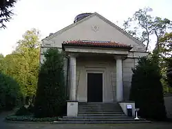 - Das erste, einfache Leichenhaus wurde durch Neubauten 1856 und 1881 ersetzt. Die heute noch bestehende Trauerhalle (mit Taharahaus) und das kleine Wohnhaus für den Friedhofsgärtner wurden 1910/11 nach Plänen von Carl Börnstein[4] und Emil Kopp geschaffen.