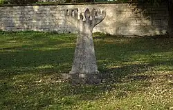 Seit dem 9. November 1990 erinnert am südlichen Eingang des Friedhofs ein Mahnmal des einheimischen Künstlers Franz Peter Burger an die Opfer der nationalsozialistischen Gewaltherrschaft. Das aus Treuchtlinger Marmor geschaffene Denkmal stellt eine Kombination einer Menora und eines Lebensbaumes dar. Beide Teile werden durch eine kleine Flamme verbunden beziehungsweise getrennt. Sie versinnbildlicht sowohl das unermessliche Leid, das den jüdischen Mitbürgern angetan wurde, als auch Heilung, Läuterung und neues Leben.[3]