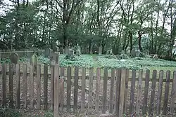 Ein Grabstein aus (Granit) mit der Inschrift „Drei Russische Kriegsgefangene“ markiert ein Sammelgrab aus der Zeit des Zweiten Weltkriegs für drei sowjetische Zwangsarbeiter.