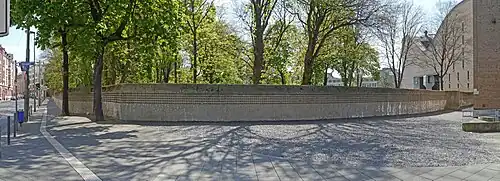 Namensblöcke als Fries an der Außenmauer des Friedhofs -