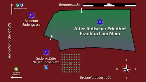 Die Frankfurter Judengasse, das von 1462 bis 1796 bestehende jüdische Ghetto, wurde in der Nähe des Friedhofs angelegt. An ihrem südlichen Ende mündete die Judengasse in den Judenmarkt. Von diesem Platz gelangte man mit wenigen Schritten zur südwestlichen Pforte der Friedhofsmauer,[4] da der ummauerte Bereich mit einem westlichen Ausläufer fast bis zum Judenmarkt reichte. Vor allem in diesem südwestlichen Bereich hat sich der Verlauf der Friedhofsmauer aufgrund von Baumaßnahmen geändert, ansonsten ist er über die Jahrhunderte weitgehend unverändert geblieben.