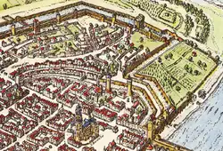 - ↑ Die Spitze des südwestlichen Vorsprungs der ummauerten Fläche liegt genau zwischen den Spitzen der beiden Türme in der Bildmitte (der linke Turm ist der Mönchsturm, der rechte der Fronhofturm).