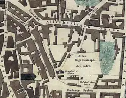 - ↑ Zu den kurzen Wegen vgl. Modell des Judenmarkts mit Umgebung (etwa Mitte 19. Jahrhundert) auf lilit.de. In der Mitte der Judenmarkt, von oben mündet die Judengasse ein. Rechts der Friedhof.