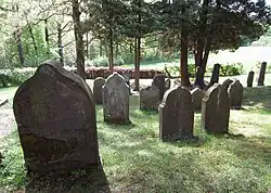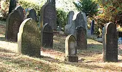 Materialien, Formen und Inschriften der Grabsteine reflektieren die Chronologie des Orts. Die älteren Steine aus der Zeit bis in das späte 19. Jahrhundert sind überwiegend aus Sandstein in hochrechteckiger Form, oberseitig mit traditionellem Rundbogenabschluss.[12] Ihre Beschriftung ist bis zur Jahrhundertmitte nur in Hebräisch, dann beginnen sich kurze Angaben in deutscher Sprache auf der Rückseite zu ergänzen.[13] Zum Jahrhundertende wechselt das Deutsche auf die Vorderseite, sich dort zunächst noch der hebräischen Inschrift unterordnend.[13] Die Grabsteine dazu sind aus poliertem Granit und von zunehmend mannigfaltiger Form, besonders häufig mit Obeliskenmotiv.[12] Das Hebräische wandert hinab zum Sockel des Steins oder auf dessen Rückseite, zum Teil wird es ganz aufgegeben.[13]