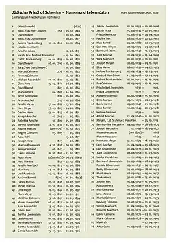 Anschel Jakob (um 1755 Bochum? – 1817), Albert Anschel (1840 Schwelm – 1922), Aron Anschel (1795 S. – 1866), Joseph Anschel (1793 S. – 1873), Julie Anschel (1832 S. – 1909), Levi Anschel (1830 S. – 1903), Rebekka Anschel gb. Loeb (1800 Leutersdorf – 1884), Amalie Auerbach (1873 Langerfeld? – 1886), Levi Auerbach (1821 Niederfell – 1888), Rosette Auerbach gb. Nathan (1873 Köln? – 1935), Sara Auerbach gb. Simson (1832 Langenberg – 1911), David Barmé/Barmen (1803 Vettweiß? – 1865), David Barmé (1847 Langerfeld – 1918), Elise Barmé gb. Winter (1845 – 1918), Gudula/Julchen? Barmé gb. Cahn (1810? – 1893), Max Barmé (1880 Langerfeld – 1907), Leni/Helene Buscher/Bouscher (1904 Gevelsberg – 1923), Calm Calmann (1810 S. – 1877), David Samuel Calmann (1876 S. – 1935), Hedwig Calmann gb. Rosenberg (1870 Dortmund – 1933), Helene Calmann (1839 S. – 1919), Ilse Calmann (1905 S. – 1914), Jenny Calmann gb. Kanin (1847 Halle/Saale – 1882), Marcus Calmann (1776 S. – 1853), Friederike/Fromet Calmann gb. Behrens (ca. 1780 – 1860), Marie Calmann gb. Klein (1878 – 1940), Melchior Calmann (1841 S. – 1899), Moritz Calmann (1872 S. – 1935), Regine Calmann gb. Cohn (1805 Grimlinghausen – 1883), Arthur Cohn (1906 Attendorn – 1943), Rosa Dahl (um 1816 S. – 1877), Carl Coppel Frankenberg (1819 Langenfeld – 1878), Helene Frankenberg gb. Rosenthal (1834 – 1912), Juliana Frankenberg gb. Ernst (1820 Lüttringhausen – 1864), Robert Frankenstein (1914 S. – 1914), Auguste Herz gb. Gottschalk (1848 Essen – 1931), Clara Herz (1881 S. – 1889), Emma Herz gb. Oster (1864 – 1902), Josef Herz (1850 S. – 1931), Joseph Herz (um 1804 S. – 1881), Markus Herz (1801 S. – 1865), Max Herz (1858? S.? – 1888?), Moses/Moritz Herz (1855 S. – 1927), Pauline Herz gb. Löwenstein (1820 Steele – 1907), Thekla Herz gb. Ruben (1882 Lübbecke – 1929), Bernhardine Herzsohn gb. Geldmacher (1801 Schwerte – 1875), Joseph Herzsohn (1796 S. – 1877), Meyer Herzsohn (1805 S. – 1847), Moses Herzsohn (um 1800 S. – 1848), Bela Frau Herz Joseph/Joseph Sohn gb. Melchior (1768 Bork/Selm – 1842), Ida Krahl gb. Herschmann (1870 Vysočany/Žatec – 1941), Bernhard Löwenstein (1864 Borgentreich – 1925), Bertha Löwenstein (1855 – 1903), Betty Löwenstein (1869 Borgentreich – 1934), Karl/Carl Löwenstein (1870 Borgentreich – 1923), Frieda Löwenstein (1872 Borgentreich – 1932), Friederike Löwenstein gb. Ostheim (1832 – 1915), Jakob Löwenstein (1853 Borgentreich – 1906), Julie Löwenstein (1859 Borgentreich – 1925), Rosalie Löwenstein (1857 Borgentreich – 1927), Fanny Marcus gb. Feidelberg (1836 Altena – 1907), Lina Marcus gb. Jungbluth (1876 Heisingen – 1940), Meyer Marcus (1832 Hattingen – 1895), Moritz Marcus (1871 S. – 1933), Otto Marcus (1876 S. – 1918), Regina Marcus gb. Herz (um 1779 Canstein/Marsberg – 1874), Herz Markus (um 1812 S. – 1884), Amalie Meyer gb. Würzburger (1816 Bochum – 1869), Carl Otto Meyer (1873 S. – 1908), David Meyer (um 1760 Linn/Krefeld – 1844), Bella Frau David Meyer ( – 1827), David Meyer (1799 S. – 1889), Elise Meyer gb. Simon (1850 Düsseldorf – 1923), Emil Meyer (1844 S. – 1897), Flora Meyer gb. Landau (1851 – 1919), Sara Hanna Meyer gb. Joseph (1815 Kettwig? – 1840), Hermann Meyer (1873 S. – 1922), Herz Meyer (1807 S. – 1889), Joseph Meyer (1839 S. – 1911), Rosa Meyer (ca. 2.10.1804 S. – 6.3.1884), Mirjam Tochter des S(chmue)l Hakohen ( – 1713, nur Grabstein erhalten), Abraham Podemski (1894 Lodz – 1916), Bernhard Rosendahl (1840 S. – 1905), Bertha Rosendahl gb. Bielefeld (1846 – 1918), Bertha Rosendahl gb. Stern (1830 – 1874), Gerda Rosendahl (1904 S. – 1906), Jette Rosendahl gb. Hirsch (1816 – 1865), Julie Rosendahl gb. Bielefeld (1840 Köln – 1905), Marcus Rosendahl (1826 S. – 1882), Michael Rosendahl (1800 Ergste? – 1861), Sarah Frau Michael Rosendahl gb. Moses ( S. – 1842), Moses Rosendahl (1832 S. – 1902), Bernhard Stern (1847 Hennen/Iserlohn – 1909), Gesine Stern gb. Lindenberg (1843 – 1871), Rika/Friederike Victor gb. Seehoff (1835 Beverungen – 1920), Jacob Victor (1835 Driburg – 1907), Gertrud Wendriner (1906 – 1913), Isidor/Isedor Wendriner (1865 Breslau – 1925)