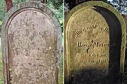 Meyers Grabstein ist von ähnlich traditioneller Gestaltung wie der des Vaters, weist auf der Rückseite aber bereits eine deutsche Inschrift auf. Der Grabtext beschreibt Meyer als „Hirten seiner Gemeinde“ und „weisen und teuren Mann“.[43] Ein benachbarter, stark verwitterter Stein (Nr. 11) wird seiner Frau Sara Chana zugeschrieben und nennt diese „die Krone ihres Mannes“.[44]