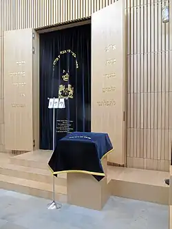 - Synagoge: Über den Gemeindesaal hat der Architekt die zweigeschossige Synagoge gesetzt, die eine Art Kuppel als Bekrönung hat, durch deren Lichtöffnungen eine besondere Art der Beleuchtung des Innenraums erreicht wird. Dieser ist weitgehend mit Holz ausgekleidet. Der untere Teil, der Gebetsbereich für rund 100 Männer, enthält den Thoraschrein und die Bima. Der obere Teil ist die Frauenempore, die für 60 Personen Platz bietet.