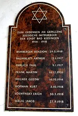 An der rechten Seite der Vorhalle des Taharahauses wurde eine metallene Gedenktafel zu Ehren der im Ersten Weltkrieg gefallenen Soldaten aus der jüdischen Gemeinde Bad Kissingen errichtet. Unter dem Davidstern und der Inschrift „Zum Gedenken an gefallene jüdische Mitbürger der Stadt Bad Kissingen 1914 – 1918“ sind die Namen der acht gefallenen jüdischen Gemeindemitglieder aufgeführt: