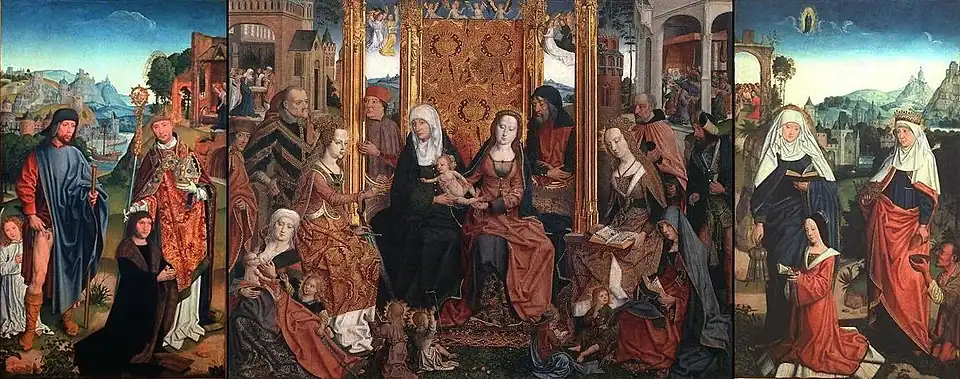 Der geöffnete Altar zeigt als Triptychon auf der Mitteltafel die namensgebende Heilige Sippe und auf den Flügeln die beiden Stifter, Nicasius Hackeney und seine Frau Guetgin van Merle. Auf der Mitteltafel hat der Künstler im Halbkreis Anna selbdritt – also die Heilige Anna, die Gottesmutter Maria und das Jesuskind – sowie die heilige Katharina von Alexandrien und die Heilige Barbara versammelt. Im Vordergrund sind die beiden Halbschwestern Marias, Maria Kleophas und Maria Salome, mit ihren Kindern abgebildet. Hinter ihnen stehen Joseph und Joachim. Als Zentrum des Bildes hat der Künstler einen prunkvollen Thron mit vier goldenen Säulen und einem goldgewirkten Brokat-Teppich als Rückwand entworfen. Dort stellt er Anna, die Gottesmutter Maria und Jesus in einer Dreieckskomposition dar. Ein Ringtausch zwischen dem Jesuskind und Katharina darf als mystische Vermählung und als Symbol für die geistige Vermählung einer Ordensfrau mit Christus interpretiert werden.[13][14] Auf den Außenflügeln werden die Stifter von ihren Namenspatronen – dem heiligen Nicasius und dem heiligen Rochus auf dem linken Flügel und der heiligen Gudula mit der heiligen Elisabeth von Thüringen auf dem rechten Flügel – empfohlen. Stifter und Patrone sind auf einer detailreichen Phantasielandschaft arrangiert, die Städte, Häfen und Gebirgszüge zeigt. Im Hintergrund werden in vier kleinen Szenen Begebenheiten aus dem Marienleben dargestellt: Christi Geburt, die Darbringung im Tempel, der Tod Mariens und Maria Himmelfahrt.[15][14]